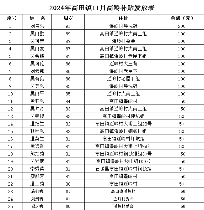 【老年人申领补贴和发放信息】2024年高田镇遥岭村11月高龄补贴发放表