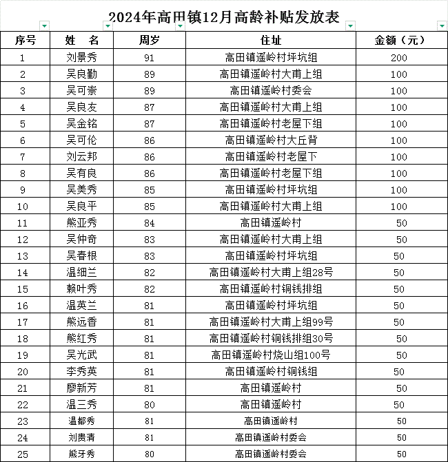 【老年人申领补贴和发放信息】2024年高田镇遥岭村12月高龄补贴发放表